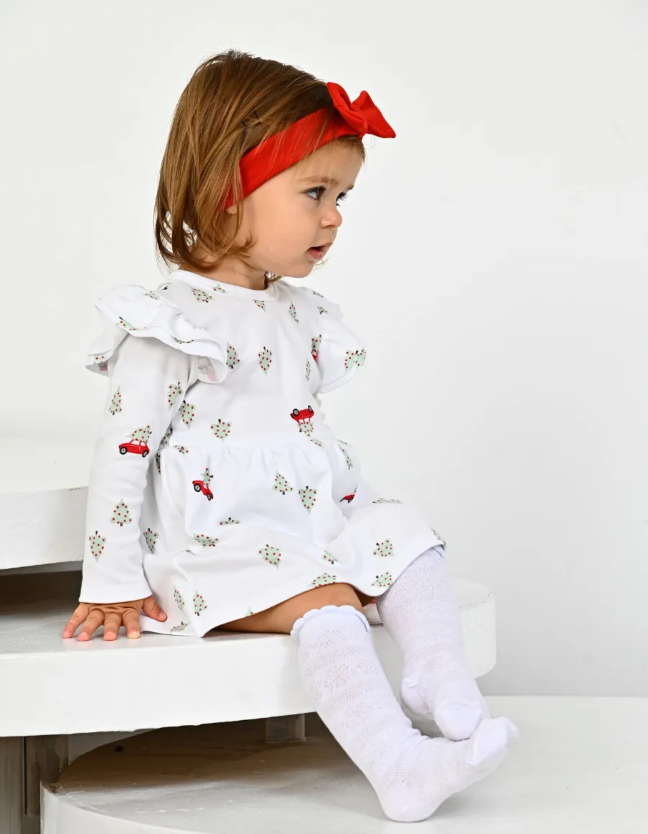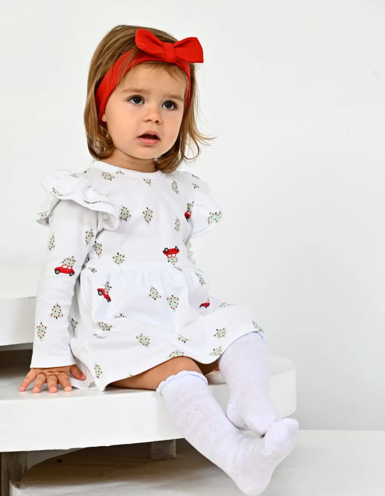 Боди-платье "Машинка с елкой" с красной повязкой, белый