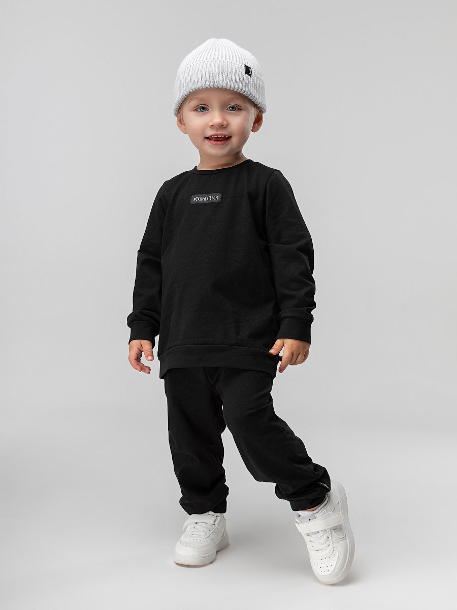 Прямой свитшот без подкладки с поясом по низу изделия, рукавами с манжетой. На полочке нашивка "с характером". Прямые брюки на поясе с внутренней резинкой. Брюки с манжетой.