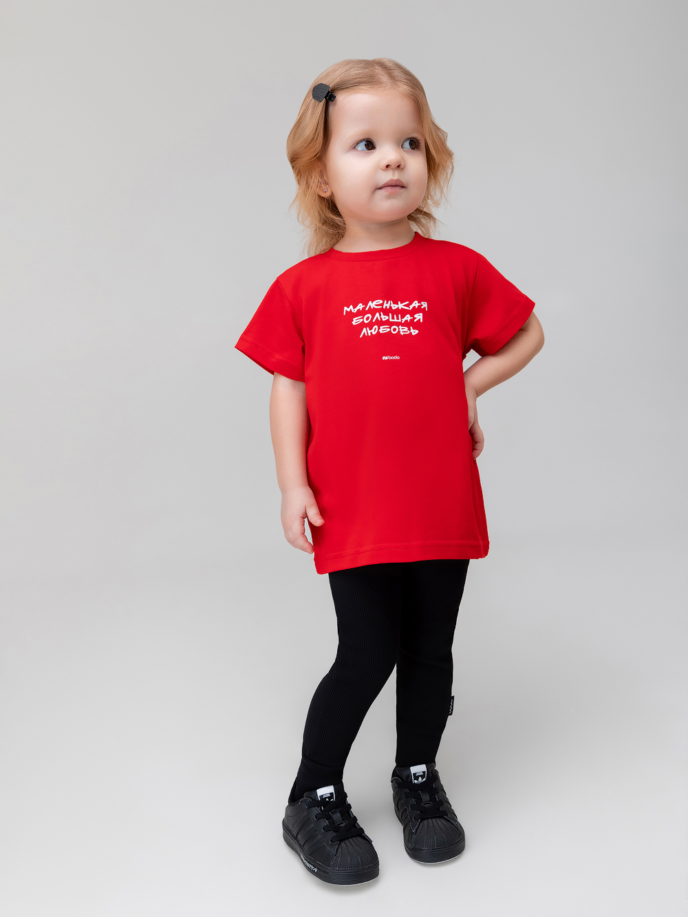 Футболка прямого силуэта, с коротким рукавом. Горловина округлой формы. На полочке располагается принт "Маленькая большая любовь"